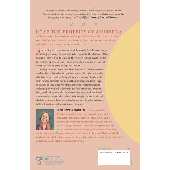 Seasonal Self-Care Rituals: Eat, Breathe, Move, and Sleep Better—According to Your Dosha. Utilize Ayurvedic wisdom to feel better all year by paying particular attention to the season you're in. According to ancient Ayurvedic texts, "All diseases begin at the junctions of the seasons," and Seasonal Self-Care Rituals build upon this idea to help readers stay in sync. With more than a decade of experience, Chopra-certified teacher Suan Weis-Bohlen provides an introduction to Ayurvedic practices like meditation, break work, mantras, yoga, and more; a dosha quiz; a practical guide to the seasons and how they relate to each dosha; personalized guidance; and food as medicine recipes. These healing rituals will support everything from ideal body weight to mental clarity and emotional wellness.