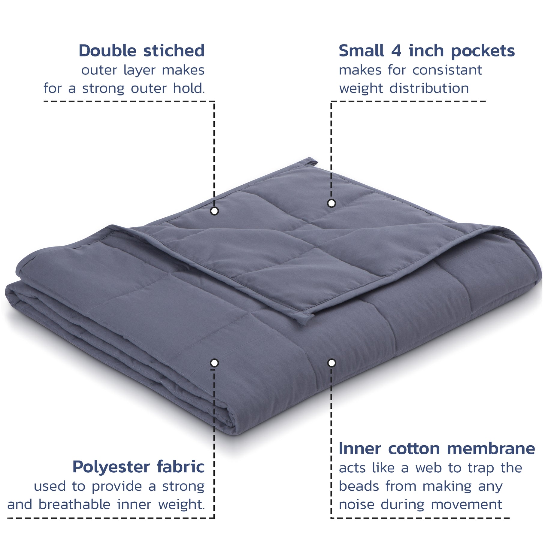 This 8lb weighted throw was designed for winding down, that perfect movie night-in, or just taking a warm and cozy afternoon nap. Hush took the essentials from their other best-selling blankets and made this the perfect weight and size for cuddling on the couch, recliner, or bed. The Hush Throw will provide you with much-needed stress-relief whenever you need it, while still being light enough to move around easily. Inner material = premium recycled non-toxic glass beads. 5x5 triple-stitched weight pockets for even weight distribution.