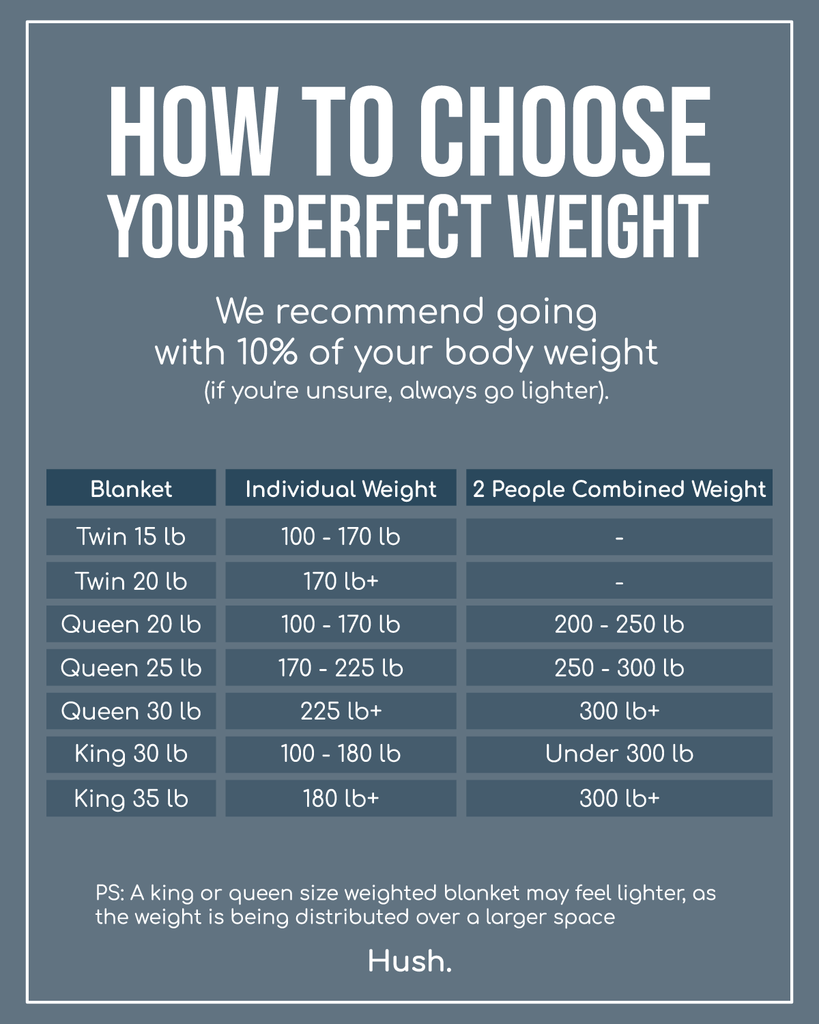 Simply get the blanket that's 10% of your body weight or 10% of you and your sleep partner's combined weight. And, if you're in-between weights, simply go for the heavier blanket.