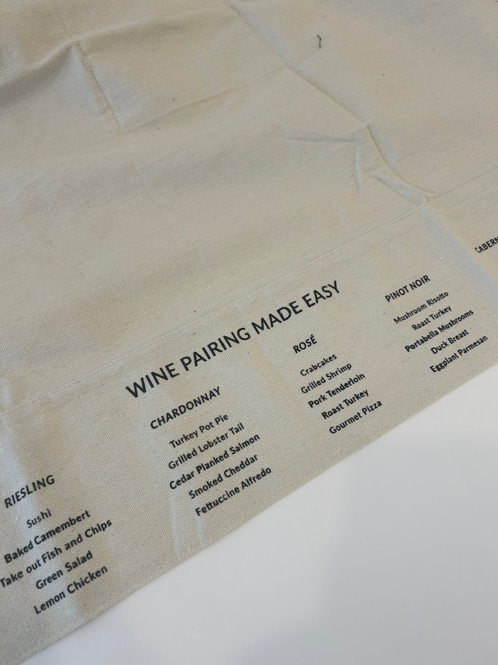 - Hidden wine pairing suggestions under the apron flap